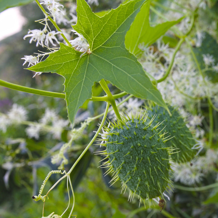 Le concombre grimpant (Echinocystis lobata) est une plante annuelle originale et ludique, idéale pour ajouter une touche de verdure légère et aérienne aux jardins. Vigoureuse et facile à cultiver, cette grimpante produit des fruits hérissés non comestibles, qui intriguent petits et grands, et attire de nombreux insectes pollinisateurs grâce à son nectar. Parfaite pour habiller les clôtures, treillis et pergolas, elle se marie harmonieusement avec d’autres plantes grimpantes dans les aménagements naturels ou champêtres.