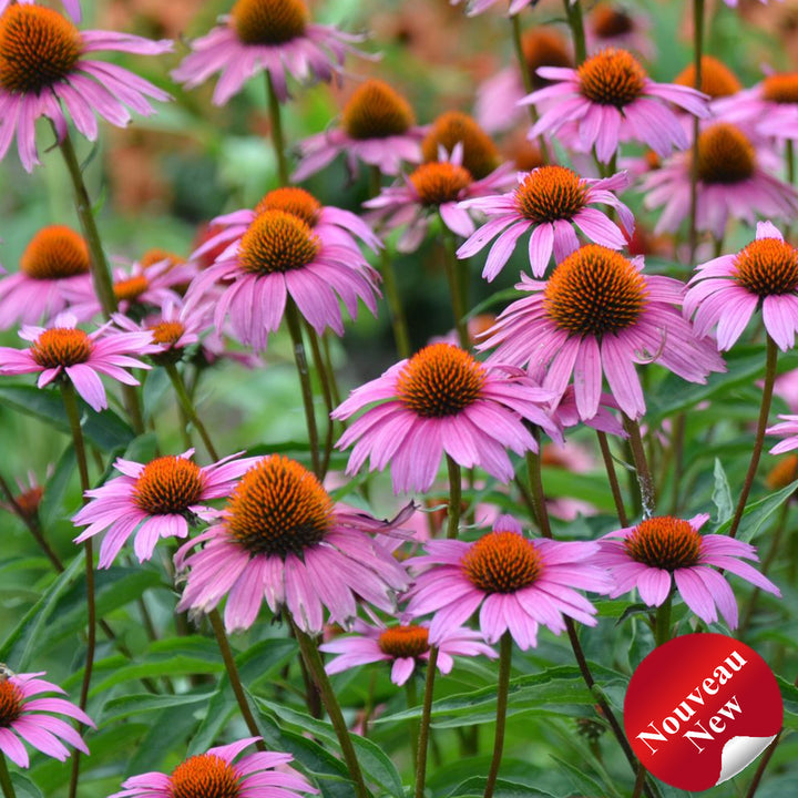 Portée par des tiges robustes d’un vert légèrement plus foncé, cette version améliorée de la Magnus se distingue par une profusion de fleurs d’un délicat rose lavande, chacune ornée d’un cône central orange cuivré. Possède une croissance plus régulière, une excellente tolérance aux maladies et à la sécheresse une fois bien établie.