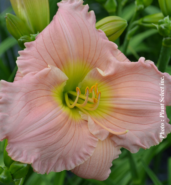 Diploïde et remontante, cette vivace produit de grandes fleurs de 15 cm de diamètre, d'un rose saumoné doux et lumineux à gorge verdâtre. Résistante à la sécheresse, elle offre une floraison généreuse et durable tout au long de la saison estivale, ajoutant une touche élégante aux jardins.