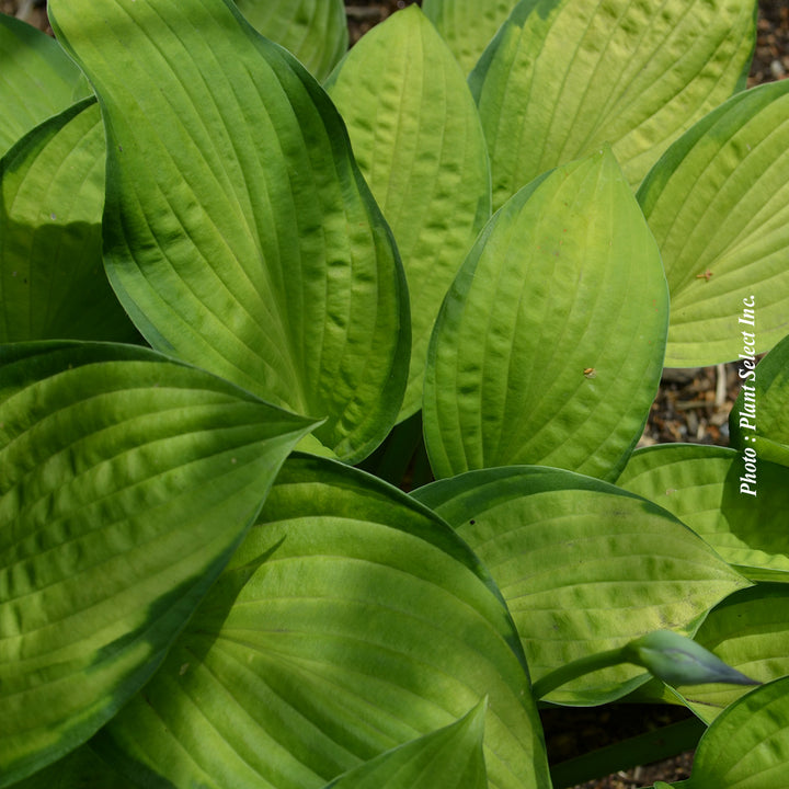 Magnifique hosta spécimen qui illumine les jardins ombragés avec son feuillage vert clair devenant doré en été et marge irrégulière vert foncé. Le soleil du matin réhausse la couleur du feuillage. Les fleurs lavande pâle apparaissent sur des tiges de 75 cm. Lent à sortir au printemps, mais sa croissance est rapide.