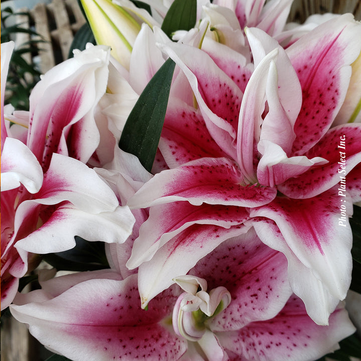 Voici un lis qui ne manquera pas d'attirer l'attention, avec ses impressionnantes fleurs doubles aux allures de roses, de couleur rose tendre à gorge rose plus foncé et picoté, dont chaque pétale est bordé de blanc, parfum discret, sans étamines. Pour la fleur coupée ou comme plante spécimen dans votre jardin.