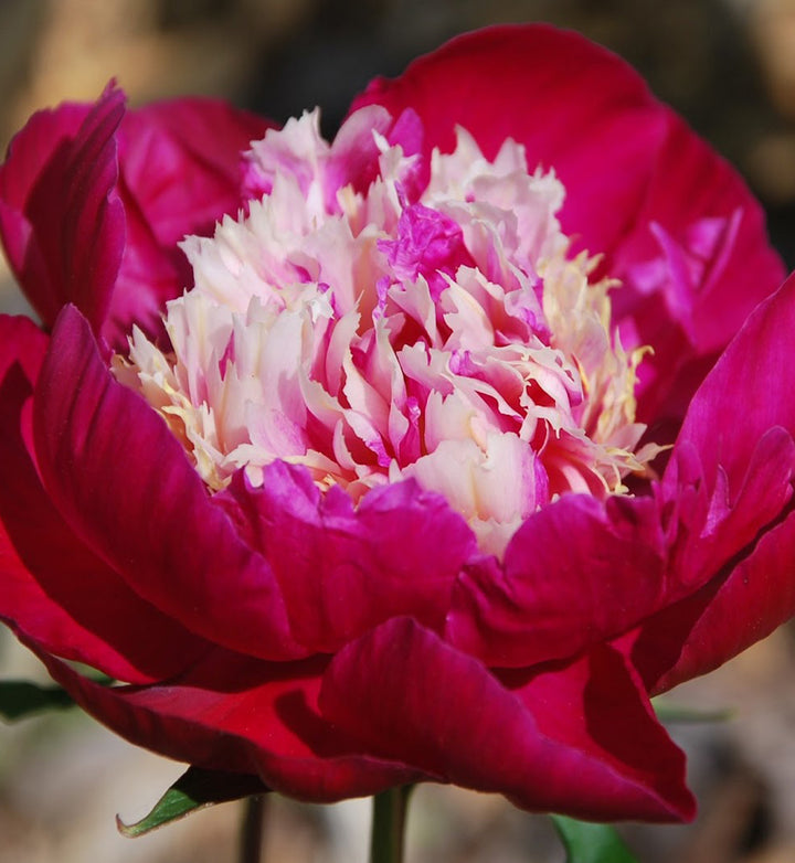 Grandes fleurs parfumées doubles de couleur framboise avec des staminoïdes rose et ivoire à la fin du printemps et début de l'été.