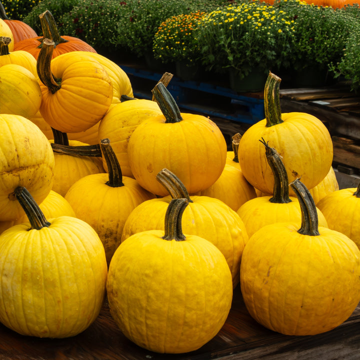 The 'Sunlight F1' pumpkin is a compact and unique variety that stands out with its bright yellow hue, adding a touch of novelty to the traditional orange colors of Halloween. With its round, ribbed fruits and a solid green handle, it offers a beautiful aesthetic for fall decorations. In addition, its compact vine and tolerance to powdery mildew make it an easy variety to grow.