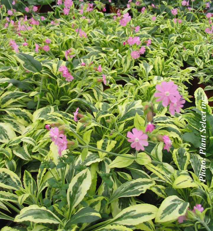 Silene 'Clifford Moor' forms a low cushion of variegated green and cream foliage, topped in summer with small, pale pink flowers. Ideal for borders, rockeries, or light pots, it adds brightness and contrast to sunny scenes. Very hardy and easy to grow.