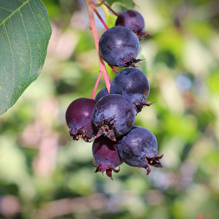Amelanchier alnifolia 'Smokey' is one of the most popular varieties for its abundant production of large, sweet, and flavorful fruits, ideal for fresh eating, desserts, or drying. Its rich, slightly vanilla flavor makes it a must-have for garden berries. It also produces magnificent white flowers in spring, followed by dark green foliage that turns yellow in autumn. This cultivar forms a dense, rounded shrub, well-suited to fruit hedges or home orchards. Very hardy and drought-tolerant, 'Smokey' is a sure bet for easy and generous cultivation, even in harsh conditions.