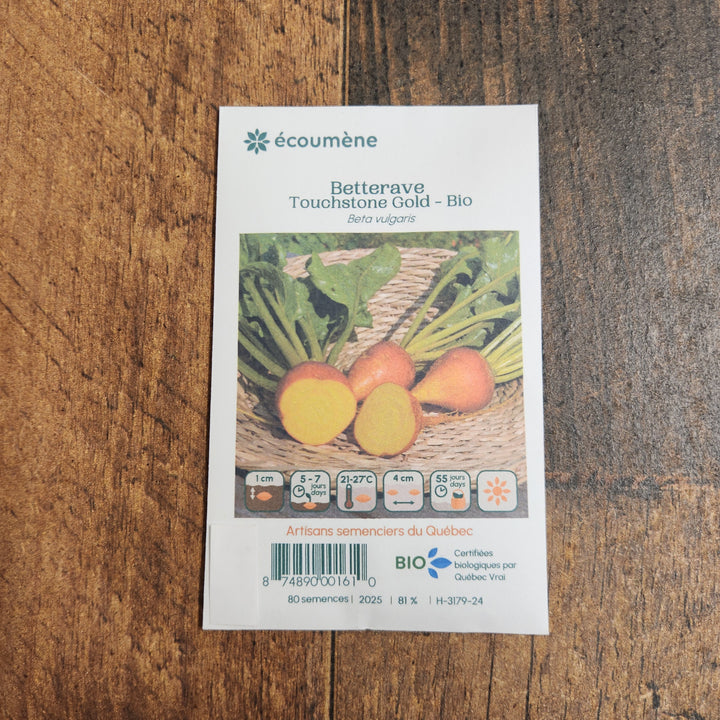 The "Touchstone Gold" beet from Jardins de l'Écoumène (Beta vulgaris) is a unique biennial variety, renowned for its yellow-orange roots. When cut, it reveals a uniform, sweet and delicate flesh, offering a mild flavor that lends itself to both raw and cooked consumption. In addition to its taste, this beet is distinguished by the fact that it does not stain, unlike red varieties, which makes it practical and attractive in the kitchen.