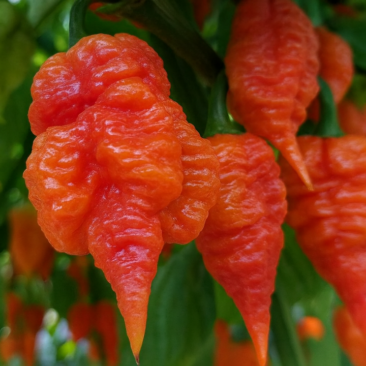 Le Piment fort ‘Death Spiral’ est l’un des piments les plus extrêmes au monde, célèbre pour sa forme torsadée, sa peau boursouflée et sa couleur vive allant de l’orange profond au rouge incandescent. Son intensité brûlante se manifeste en vagues, commençant par une chaleur fruitée, puis basculant vers une brûlure intense et durable, caractéristique des Capsicum chinense les plus puissants. Très vigoureux, productif, et apprécié des amateurs de sensations fortes, il est autant recherché pour sa puissance que pour son apparence spectaculaire.