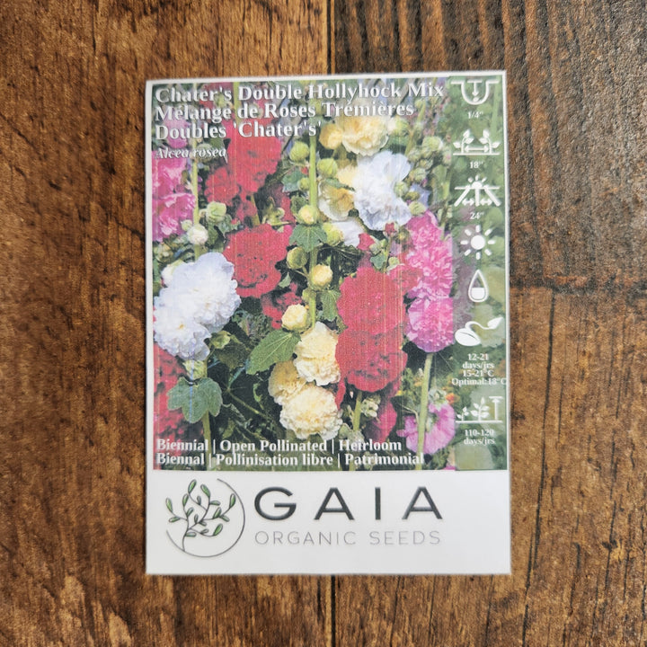 Gaia Seeds' 'Double Chater's' Hollyhock Mix (Alcea rosea) offers a dazzling floral spectacle thanks to its double and vibrant flowers, perfect for transforming your garden into an enchanting setting.