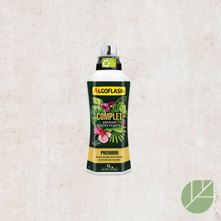 Algoflash COMPLETE All Plant Fertilizer is specially formulated to support the optimal growth of all your plants, whether green or flowering. Its innovative nutrient formulation, enriched with magnesium, calcium and iron, ensures better growth, greener leaves, more beautiful flowers, and overall healthier plants. Magnesium limits leaf drop, calcium strengthens plants and promotes root growth, while iron guarantees intense green foliage. This product is ideal for all plants, and is packaged in a bottle made of 90% recycled plastic and fully recyclable, demonstrating our commitment to the environment.