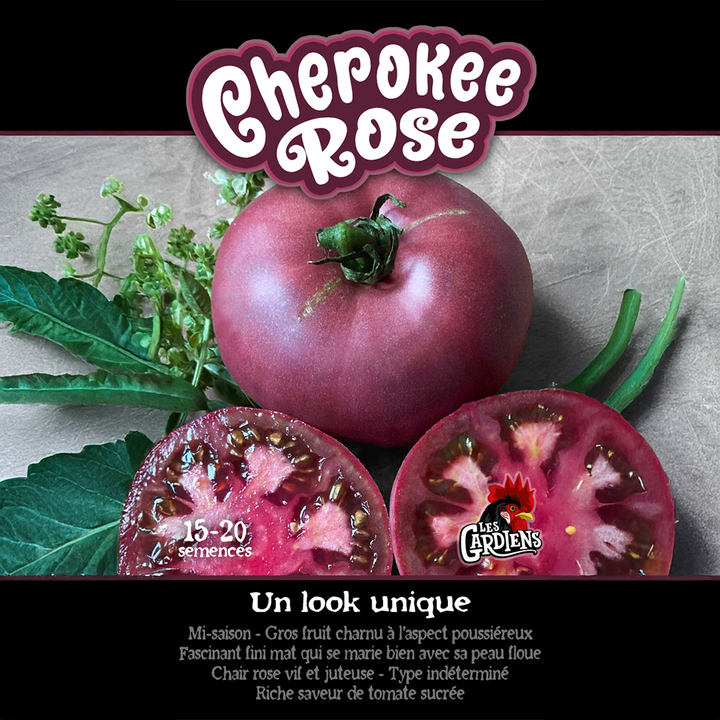 The 'Cherokee Rose' tomato is a beefsteak variety with fleshy, juicy fruits, weighing between 180 and 250 grams. Its unique pink skin, with a slightly fuzzy and dusty appearance, makes it a rare and original curiosity. With its multi-celled flesh and sweet, rich flavor, it seduces lovers of gourmet tomatoes. Ideal for salads, sauces and cooked dishes, it offers a generous production throughout the season.