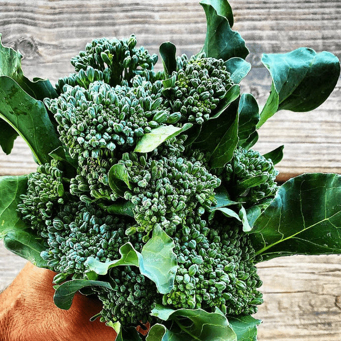 Organic 'Happy Rich' broccoli (Brassica oleracea), offered by Gaia, a bountiful and tasty harvest
