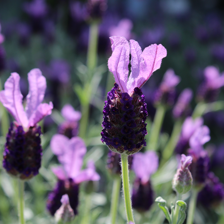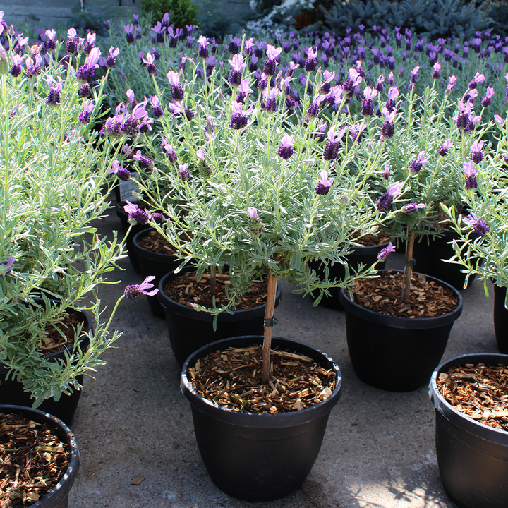 Lavender 'Anouk' ( Lavandula stoechas 'Anouk') is a striking variety of butterfly lavender, prized for its compact growth habit, prolonged flowering, and aromatic silvery foliage. Native to the Mediterranean, this lavender is distinguished by its deep purple flower spikes, topped with purple bracts reminiscent of butterfly wings, providing a striking visual display throughout the summer. Its dense growth habit and drought tolerance make it an ideal choice for borders, rock gardens, and container plantings. In addition, it attracts pollinators such as bees and butterflies, while being resistant to deer and rabbits.