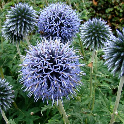 Blue thistle , also called azure ball , is a hardy perennial with spherical blue-mauve flowers , perched on slender stems of 80 cm to 1 meter . Its silvery green and thorny foliage adds a textured and luminous touch to the garden. Very melliferous , it attracts butterflies and birds , while being resistant to difficult conditions . Its long flowering, from July to September , makes it an ideal asset for beds, borders and dry gardens .
