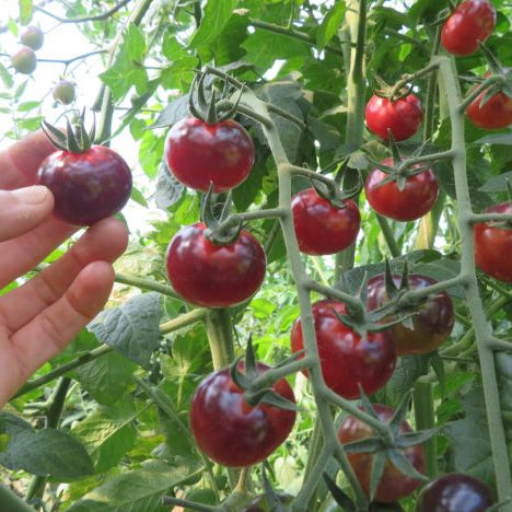 The 'Glossy Rose Blue' tomato is an exceptional and recent variety originating from Germany, producing unique cherry tomatoes with blue-purple shoulders thanks to their anthocyanin content . When ripe, they take on a beautiful pink-red hue and develop into abundant clusters of round fruits (2.5 to 4 cm in diameter).