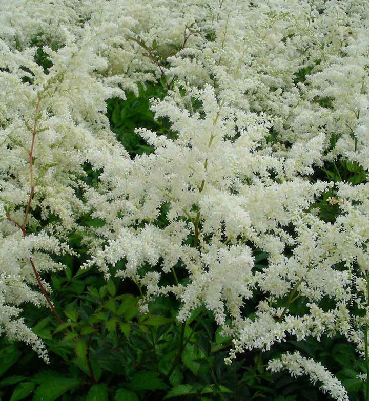 White flowers clustered in airy plumes on a medium-sized, early-flowering plant. A beautiful effect when planted in a clump.