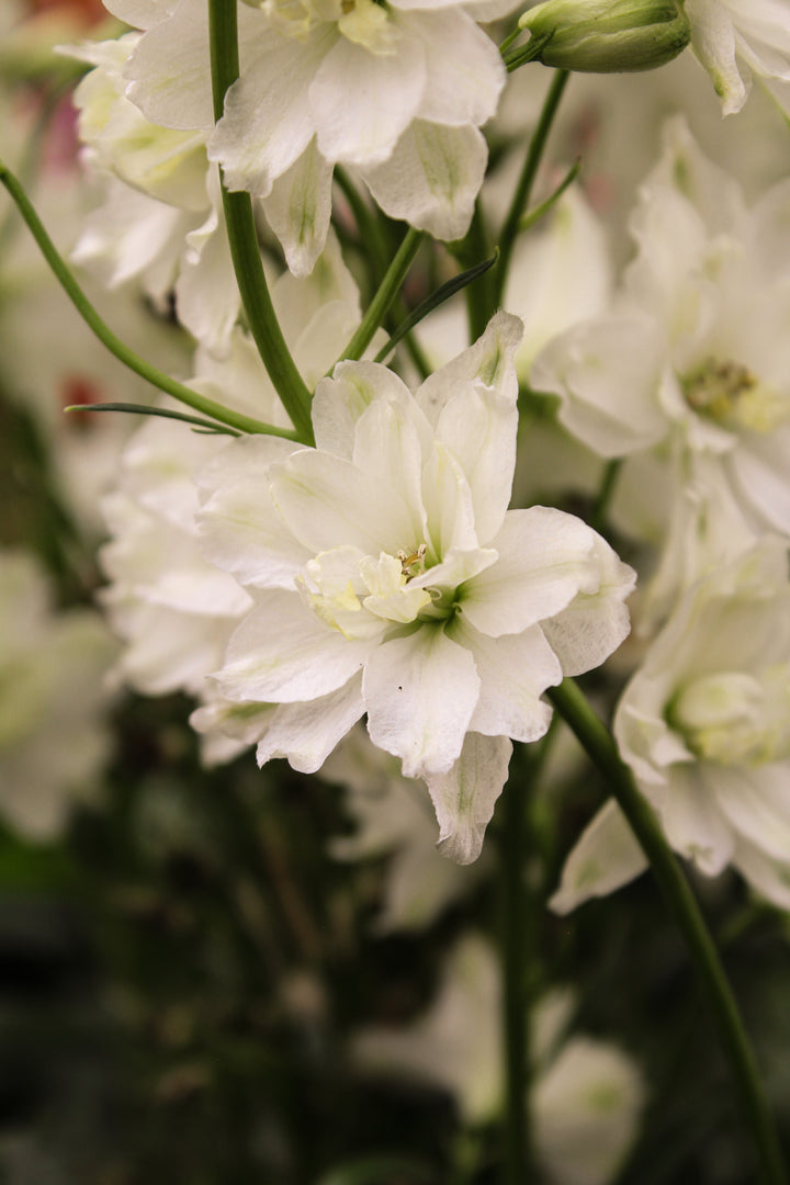 Large flower spikes of pure white double flowers on sturdy, well-branched stems, above a mound of green foliage.