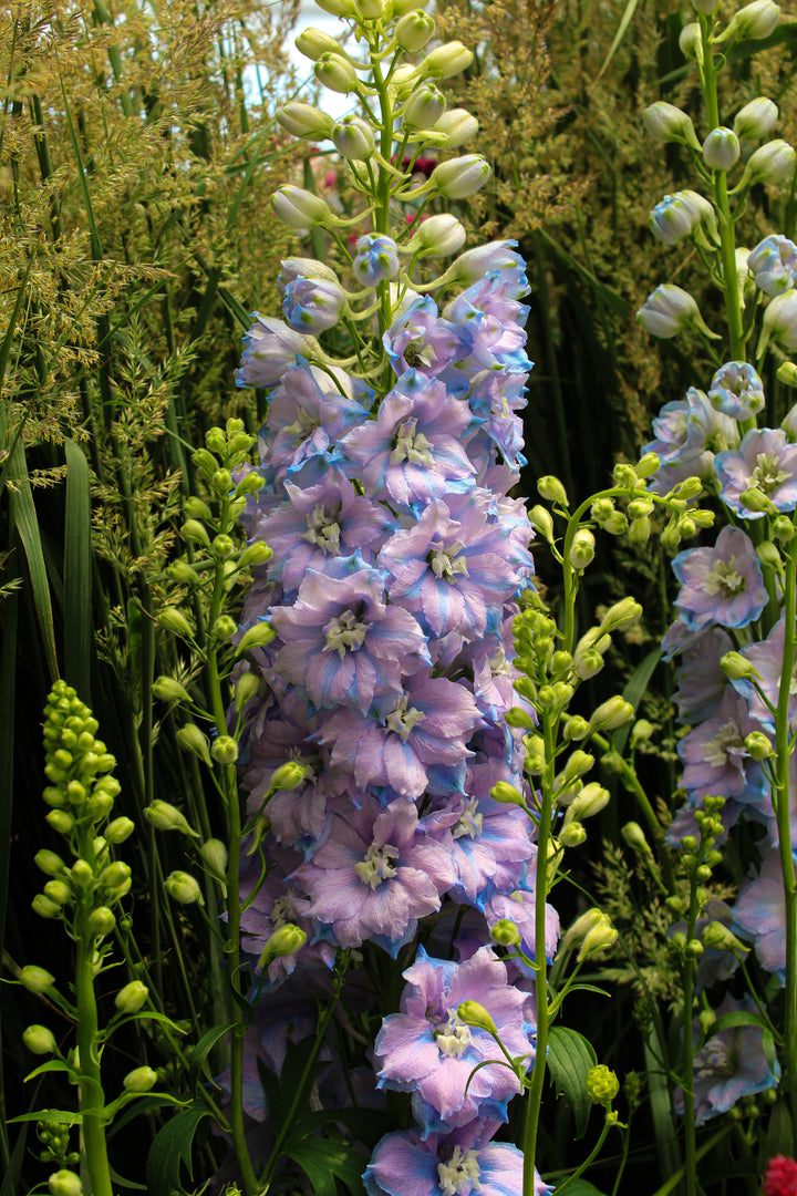 The shortest of the 'Magic Fountains' group, with its magnificent light blue flowers with pinkish eyes on strong, upright flower stems. Its more compact habit makes it less dependent on staking.