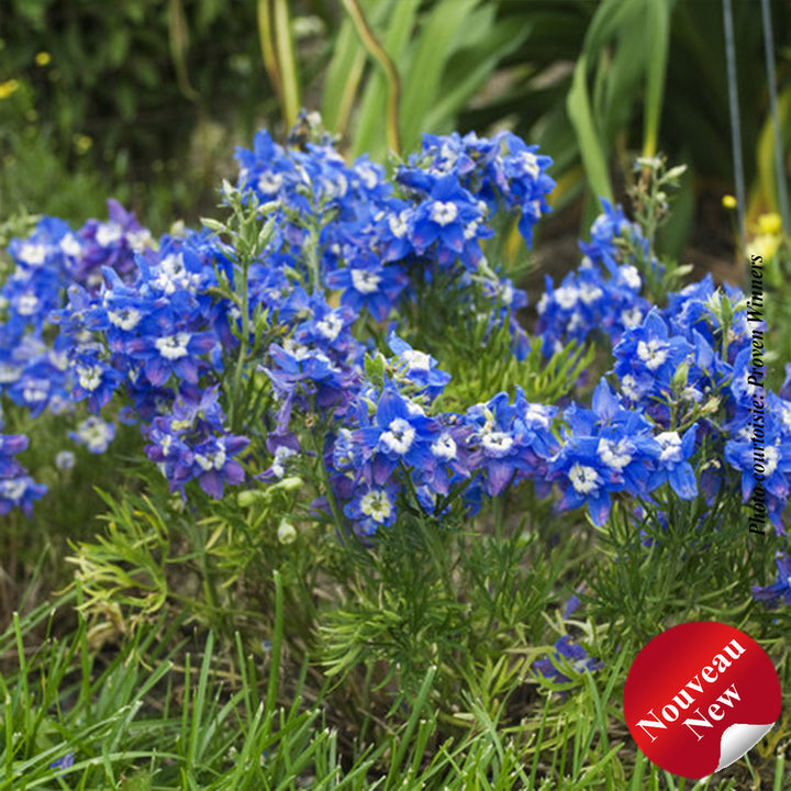 Unlike traditional large delphiniums, this variety forms a pretty little mound of dense, serrated green leaves. Its greenery bears clusters of unique, bright blue flowers with a white central eye. Remove spent flower heads regularly to encourage repeat blooms. Tolerates heat and humidity well. An exceptional cut flower.
