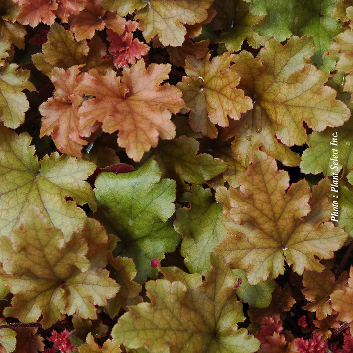 This heuchera is like the big brother of 'Amber Waves'. It features different shades of bronze, copper, and caramel on the same plant, varying throughout the season. The underside of the leaves is bright pink and does not go unnoticed. White flowers. Good resistance to full sun.