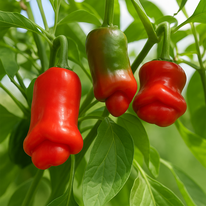 A totally unique variety that owes its popularity to the very suggestive shape of its fruits... and yes, we quickly understand where its name comes from 😆! But beyond its look, it is also a moderately hot pepper (around 10,000 to 23,000 Scoville units), with thick, crunchy and slightly fruity flesh. Perfect for hot sauces, marinades, or just to get people talking in the garden!