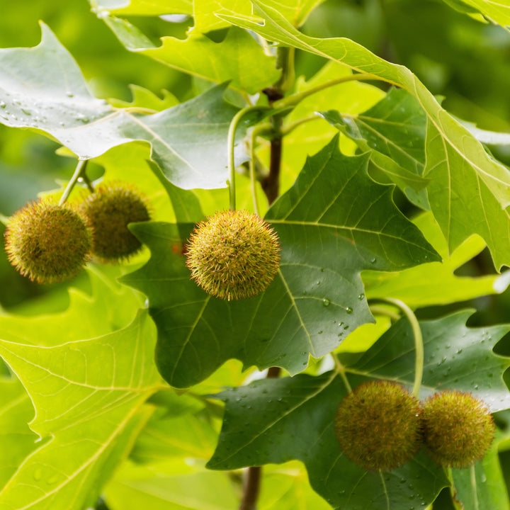 Platanus × acerifolia 'Exclamation' is a pyramidal hybrid plane tree that is highly resistant to drought, disease, and urban pollution. It is distinguished by its smooth, gray- and cream-marbled trunk and its dark green, dissected foliage that turns yellow in autumn. Its rapid growth and tolerance of urban constraints make it an excellent choice for alignments, avenues, or structural plantings in cities.