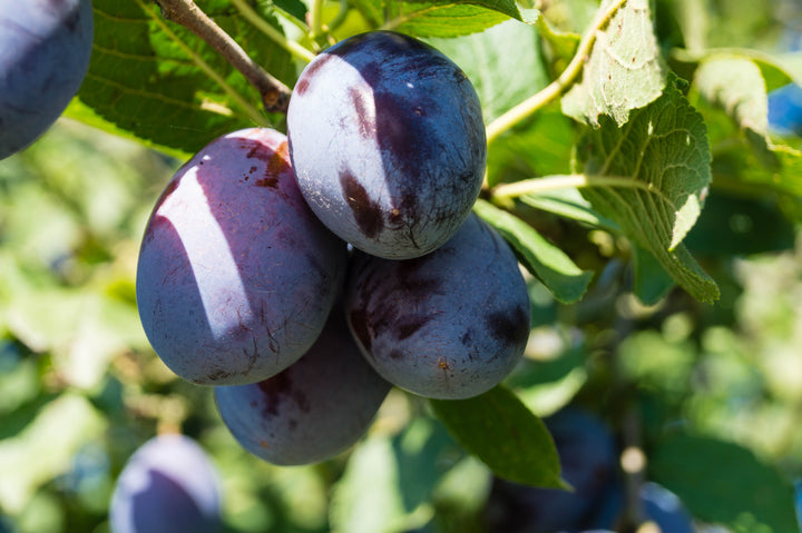 Prunus domestica 'Damson' is a traditional plum tree renowned for its small, ovoid plums with dark blue skin and firm, juicy, and very tart greenish-yellow flesh, making them particularly suitable for processing. These fruits, rich in pectin and flavor, are ideal for jams, jellies, sauces, preserves, and culinary preparations such as chutneys. The 'Damson' plum tree is generally self-fertile, producing reliably even in the absence of other pollinating varieties, making it an excellent choice for small gardens. It also stands out for its good disease tolerance and frost-resistant spring flowering. Hardy, vigorous, and easy to care for, the 'Damson' is a must-have variety for lovers of processing plums with an intense, authentic flavor.