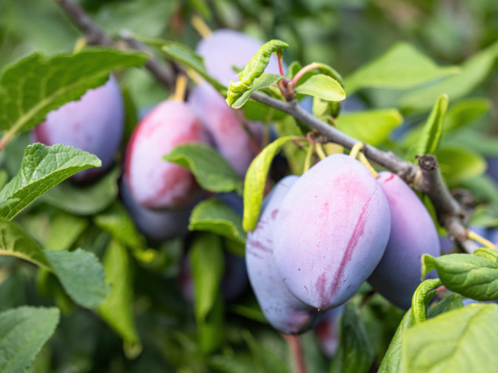 Prunus domestica 'Stanley' is a very popular European plum tree, renowned for its reliability, hardiness, and ability to produce an abundance of dark blue plums with greenish-yellow flesh that is sweet, juicy, and well-flavored. The elongated, free-stoned fruits are ideal for fresh eating, making jams, baking, and drying into prunes. 'Stanley' is self-fertile, making it particularly easy to grow, even as a solitary tree in a small orchard. It has moderate spring flowering, is resistant to late frosts, and provides a reliable harvest in late summer. Highly valued for its vigor, productivity, and the quality of its fruit, 'Stanley' is a wise choice for gardeners seeking a versatile, hardy, and easy-care plum variety.
