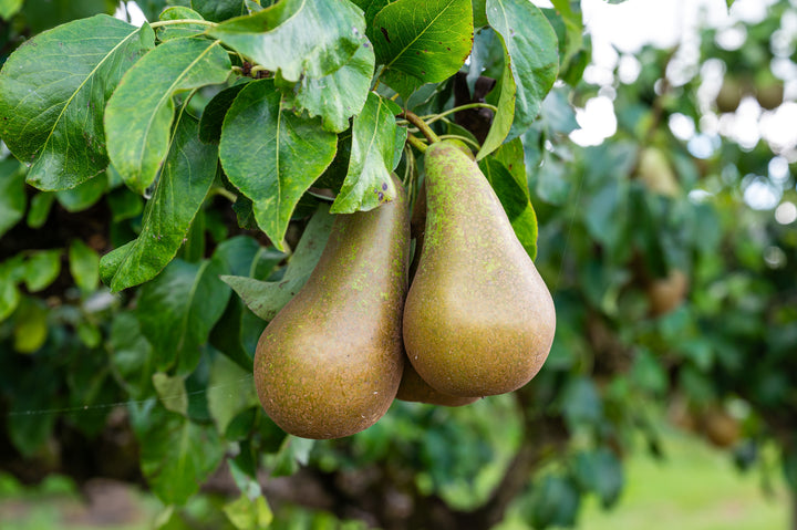 Pyrus communis 'Bosc' is an elegant, old-growth European pear variety known for its elongated, rough-skinned, cinnamon-brown fruit, sometimes adorned with pale lenticels. Its dense, sweet, and slightly spicy white to creamy flesh is ideal for fresh eating, cooking, poaching, or baking, as it retains its shape and texture well. 'Bosc' is partially self-fertile, but its production is enhanced in the presence of compatible varieties such as 'Bartlett' or 'Anjou'. Its spring blooms are abundant and ornamental, attracting pollinators. Adapted to temperate climates, this robust cultivar thrives in well-drained soil and full sun. Valued for its productivity, longevity, and exceptional fruit quality, 'Bosc' is a must-have in any well-planned orchard.