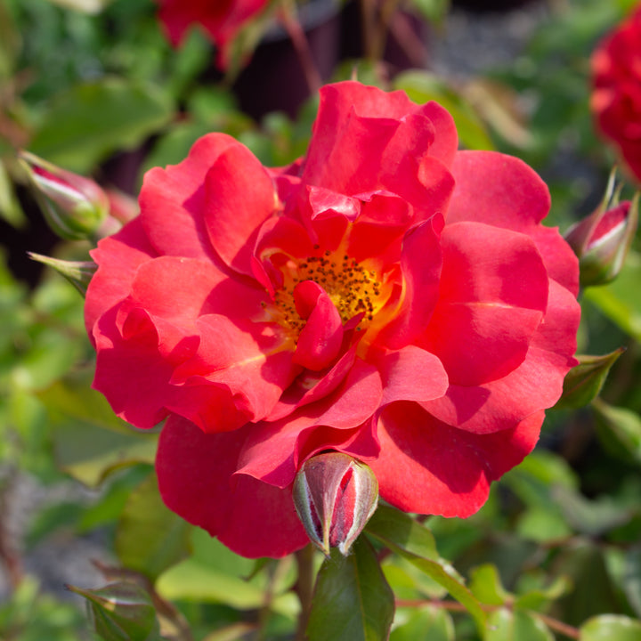 The floribunda rose 'Cinco de Mayo' (Rosa 'WEKcobeju') is an ornamental shrub notable for its abundant, uninterrupted flowering from late spring through fall. This hybrid cultivar, from the prestigious Rosaceae family, forms a compact bush with sturdy stems and glossy, dark green foliage that is highly disease-resistant. Its medium to large flowers, clustered in dense clusters, reveal a unique color blending shades of brick red, smoky lavender, and coppery orange, sometimes with magenta highlights depending on the exposure. Each flower, lightly scented with a tangy note reminiscent of apple, attracts bees and butterflies. Tolerant of a wide variety of well-drained soils and hardy to zone 5, this rose is suitable for both bedding and container planting. Its vigorous yet well-structured growth and spectacular flowering make it an ideal variety for gardeners looking for a long-lasting visual impact without compromising on robustness.