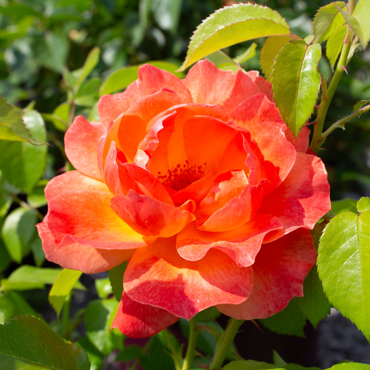 The floribunda rose 'Livin' Easy' is an explosion of good cheer in the garden, with its flamboyant flowers of an intense coppery orange, shaded with coral and apricot. Borne in generous clusters, they offer continuous and abundant flowering throughout the season. Lightly scented, they give off a fruity and warm aroma. The vigorous and well-branched bush reaches approximately 90 to 110 cm, with glossy dark green foliage, very resistant to disease. Easy to grow, vibrant and carefree, 'Livin' Easy' is perfect for bringing energy, warmth and structure to beds, borders or container plantings. A rose as beautiful as it is reliable, for gardening with ease.