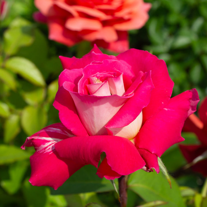 The 'Love' grandiflora rose is a classic with a striking style, featuring large, velvety red flowers edged in silvery white. Their strong, refined contrast makes this a very eye-catching variety. Slightly fragrant, but very floriferous, it offers continuous blooms throughout the season. This rose reaches approximately 120 to 140 cm, with glossy, dense foliage. 'Love' is ideal for creating a graphic effect in a bed or for composing spectacular bouquets.