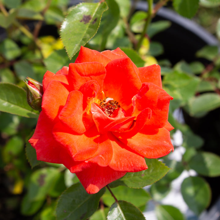 The miniature rose 'All A' Twitter' is a vibrant variety with small, bright orange flowers with tangerine highlights, grouped in abundant clusters. A very floriferous variety, it offers continuous blooms from spring until frost. Compact and well-branched, it reaches around 40 to 50 cm, with strong dark green foliage. 'All A' Twitter' is ideal for borders, containers, and small sunny spaces.