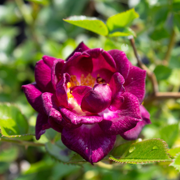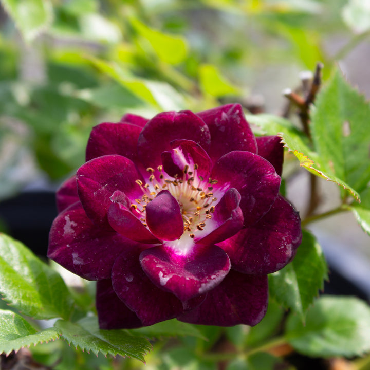 The miniature rose 'Diamond Eyes' stands out with its dark purple, almost black flowers with a silvery underside and an intense, spicy fragrance that is rare among miniatures. A very floriferous rose, it forms a small, dense, branched bush about 30 cm tall. 'Diamond Eyes' is ideal for containers, elegant borders, or for those who love deep, mysterious shades.