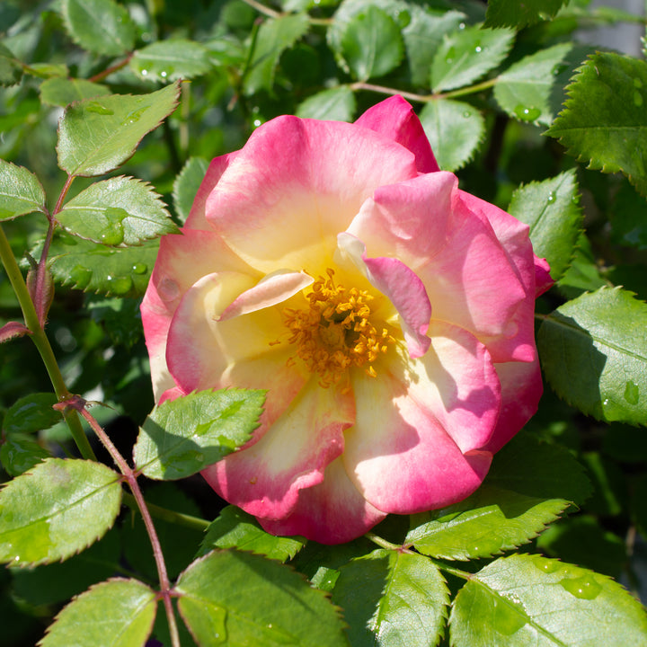 The hardy rose 'Campfire' is a very floriferous Canadian variety with two-tone creamy yellow and raspberry pink flowers, changing shades daily. It blooms continuously throughout the summer. The bush reaches approximately 90 to 120 cm, with strong dark green foliage. 'Campfire' is very hardy, easy to grow, and perfect for colorful borders.