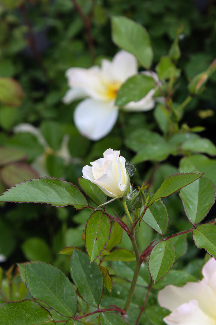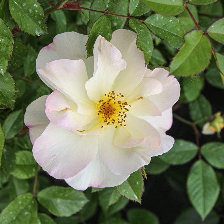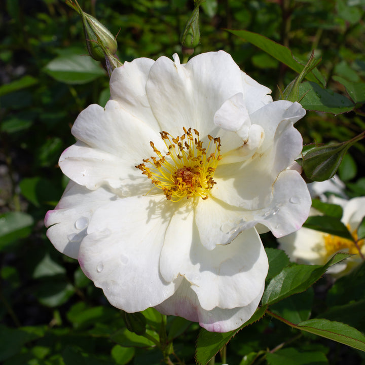 The hardy rose 'Oscar Peterson' produces single, pure white flowers with a golden center, followed by beautiful, decorative red berries in the fall. A very floriferous and hardy rose, it reaches a height of about 90 to 120 cm, with very healthy, dark green foliage. 'Oscar Peterson' is perfect for flowering hedges, open plantings, or gardens exposed to cold.
