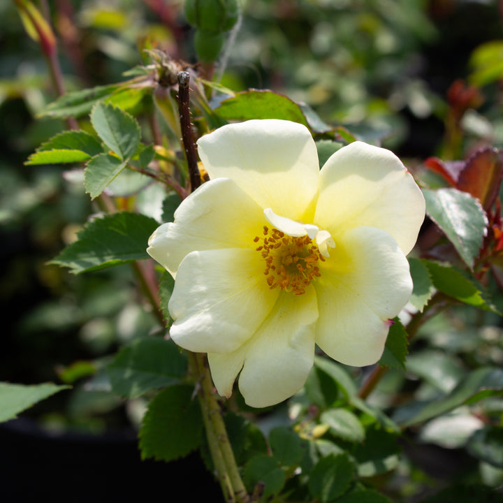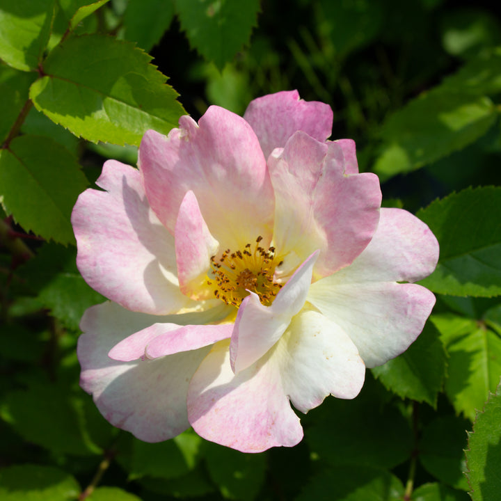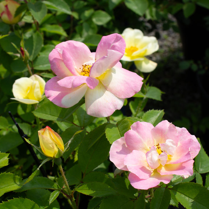 Surprising and colorful, the hardy rose 'Peach Lemonade' charms with its changing blooms, passing from lemon yellow to a soft peach pink, sometimes even on the same plant. This unique transformation creates a refreshing multi-colored effect, ideal for living beds and modern gardens. It forms a compact, rounded bush of about 60 to 90 cm, with healthy and dense dark green foliage, very resistant to disease. Floriferous and repeat-flowering, it blooms from early summer until frost without respite. Very hardy (zone 3) and tolerant of both heat and drought, 'Peach Lemonade' is perfect for borders, slopes, containers or small flower areas, bringing originality, softness and ease of maintenance.