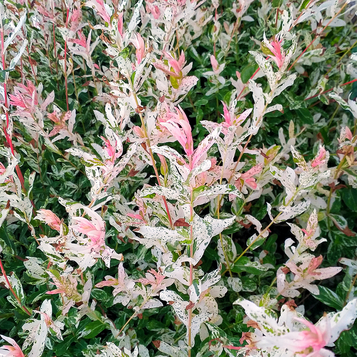 Salix integra is a willow species native to the Far East, notable for its ability to produce colorful and decorative foliage very early in spring. This species is distinguished from other willows by its supple twigs, rapid growth, and tolerance of pruning, making it an excellent basis for ornamental cultivars such as the popular 'Hakuro Nishiki'. Widely used in modern landscaping for its light structure and changing foliage, Salix integra adapts well to moist conditions and riverbanks, also contributing to soil stabilization. It responds well to formative pruning, allowing it to be grown as a compact shrub or standard. Its vigorous nature and hardiness make it a reliable species in temperate climates, ideal for providing texture and color at the first signs of spring.