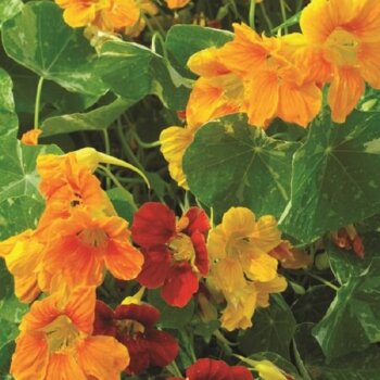 La capucine 'Out of Africa' est une annuelle traînante remarquable avec un feuillage marbré et panaché. Ses fleurs éclatantes se déclinent en jaune, rouge, crème et rose pêche, créant un tapis coloré ou décorant les treillis et les murs. Avec une hauteur pouvant atteindre 1,5 m, cette variété est idéale pour les bordures, les pots suspendus et les parterres.