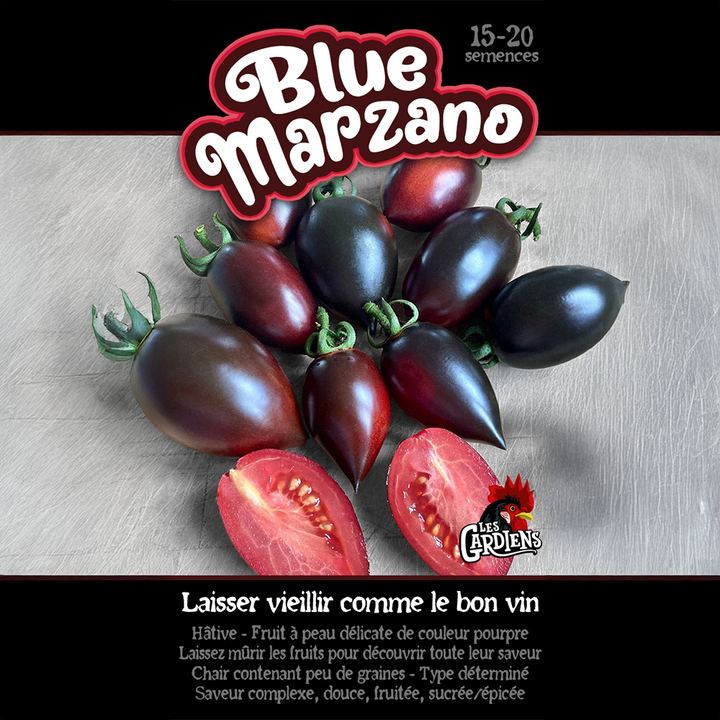 La tomate 'Blue Marzano' est une variété unique et hâtive, combinant une peau pourpre délicate et une saveur riche et complexe. Inspirée du célèbre type San Marzano, elle offre une chair charnue, douce et fruitée, avec des notes légèrement épicées et sucrées. Sa faible teneur en graines en fait une variété idéale pour les sauces épaisses, les purées et les conserves maison.