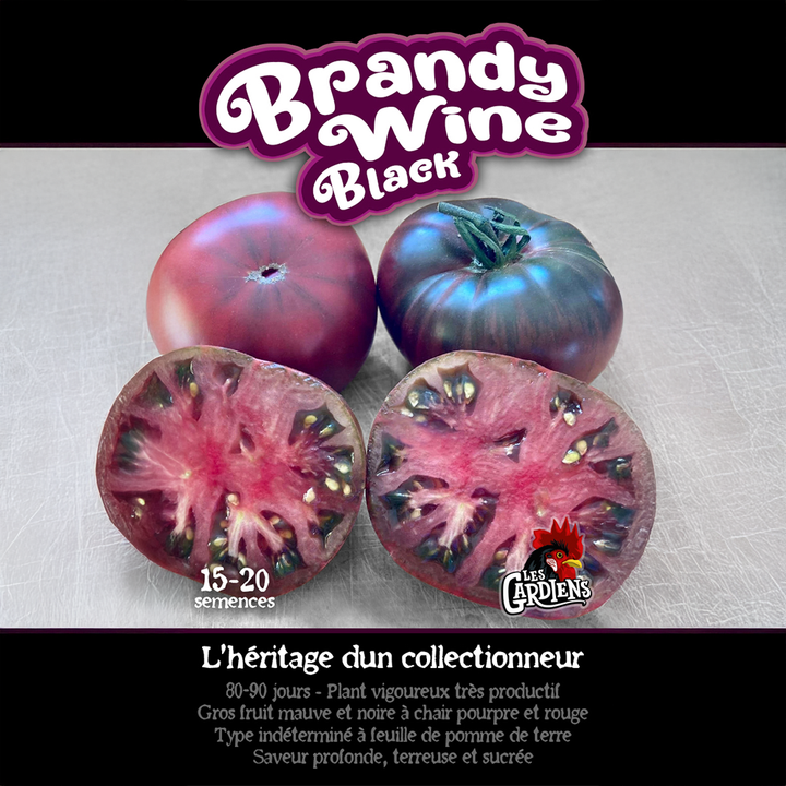La tomate 'Brandywine Black' est une variété ancestrale prisée pour ses grands fruits noirs aux nuances pourpres, sa saveur profonde et complexe, ainsi que sa texture juteuse et charnue. Elle fait partie des variétés héritage les plus appréciées et se distingue par son feuillage unique de type pomme de terre.