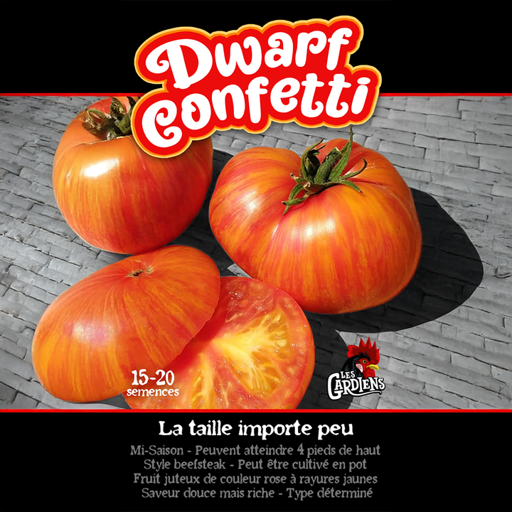 La tomate 'Dwarf Confetti' est une variété naine spectaculaire, idéale pour ceux qui recherchent une tomate beefsteak adaptée aux petits espaces. Avec ses fruits juteux rose striés de jaune, elle offre un rendu visuel exceptionnel et une saveur douce mais riche, parfaite pour une multitude d’usages culinaires.