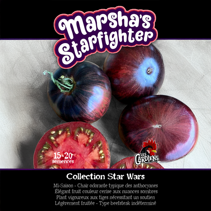 Issue de la collection Star Wars, la tomate 'Marsha’s Starfighter' est une variété spectaculaire qui ne passe pas inaperçue au jardin. Ce beefsteak indéterminé produit des fruits élégants, aux teintes profondes oscillant entre le rouge cerise et le violet sombre, avec des épaules anthocyanées qui lui confèrent une allure cosmique. Son goût est tout aussi exceptionnel : une chair odorante, légèrement fruitée, où la douceur rencontre une subtile acidité, offrant une expérience gustative riche et raffinée.