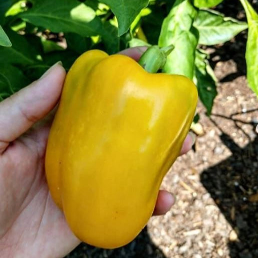 Le Poivron 'Golden California Wonder' est une variété patrimoniale prisée pour sa tolérance au froid et sa précocité, permettant des récoltes abondantes du début à la fin de la saison. Ses fruits épais et carrés (10-11 cm / 4-4,5") passent du vert au jaune doré éclatant à maturité, développant une saveur douce et croquante. Idéal pour être consommé frais, farci ou grillé, il est parfait pour tout type de culture, y compris en pot.