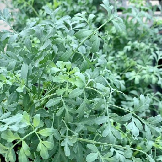 La Rue officinale est une plante vivace autrefois couramment cultivée dans les jardins pour ses propriétés médicinales et son effet répulsif naturel contre de nombreux insectes et animaux, notamment les chats et les scarabées japonais. Son feuillage finement découpé, bleu-vert, ainsi que ses petites fleurs jaunes estivales lui confèrent une élégance rustique. Bien que son usage médicinal ait diminué au fil du temps en raison de sa toxicité potentielle, elle reste une plante compagne prisée, notamment pour éloigner certains ravageurs du potager.