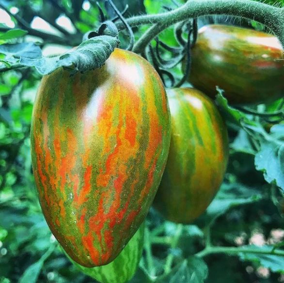 La Tomate raisin 'Atomic' est une variété spectaculaire développée par Wild Boar Farms, célèbre pour ses sélections de tomates aux teintes uniques. Ses petits fruits multicolores passent du rouge au vert olive, puis prennent des rayures marron et bleu métallique à pleine maturité, créant un effet visuel étonnant. Mais son apparence n’est pas son seul atout : sa chair est extraordinairement sucrée, avec une tenue parfaite sur la vigne et après récolte, ce qui en fait une excellente option pour les producteurs de marché et les jardiniers gourmands