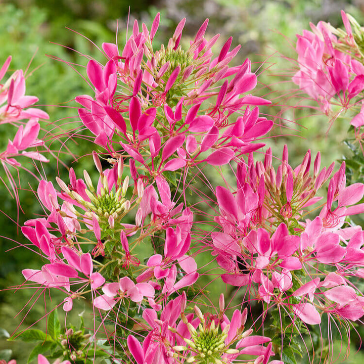 De magnifiques fleurs en grappes majestueuses, progressant du rose foncé au presque blanc, s’élèvent sur cette plante fascinante. Avant la floraison, le feuillage en forme de palme ajoute une texture unique et charmante au jardin. Les fleurs attirent les colibris et les pollinisateurs, tout en offrant une excellente option pour des bouquets. Poussant jusqu'à 100 cm de hauteur et 60 cm de largeur, la Cléome est idéale pour les sites ensoleillés et secs.