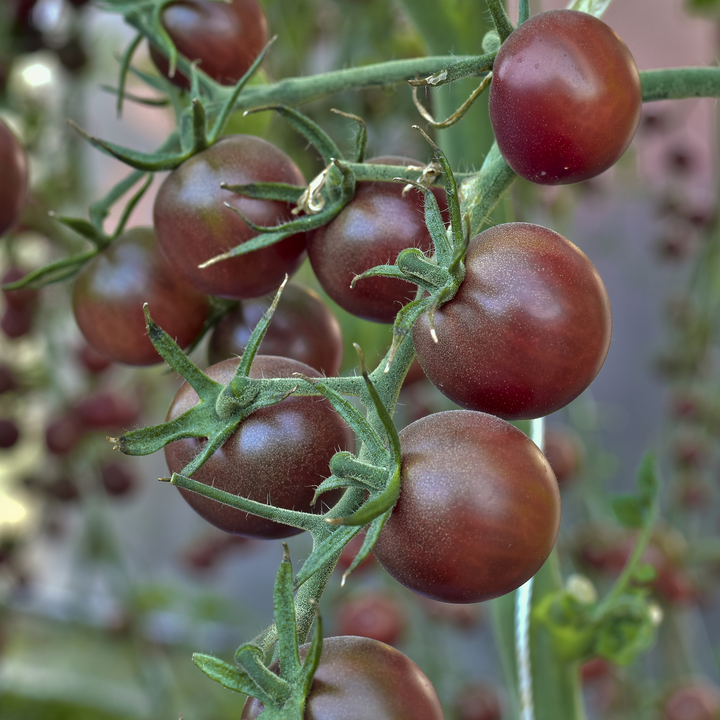 Variété gourmande et élégante, aux fruits ronds de couleur brun chocolat avec des reflets rouge foncé. Sa chair est juteuse, sucrée et complexe, avec des notes légèrement fumées. Parfaite pour les salades hautes en couleur, les apéros ou simplement à grignoter sur la vigne. Le plant, de type indéterminé, est très productif tout au long de l’été. Idéal en pleine terre ou en grand contenant avec bon tuteurage.
