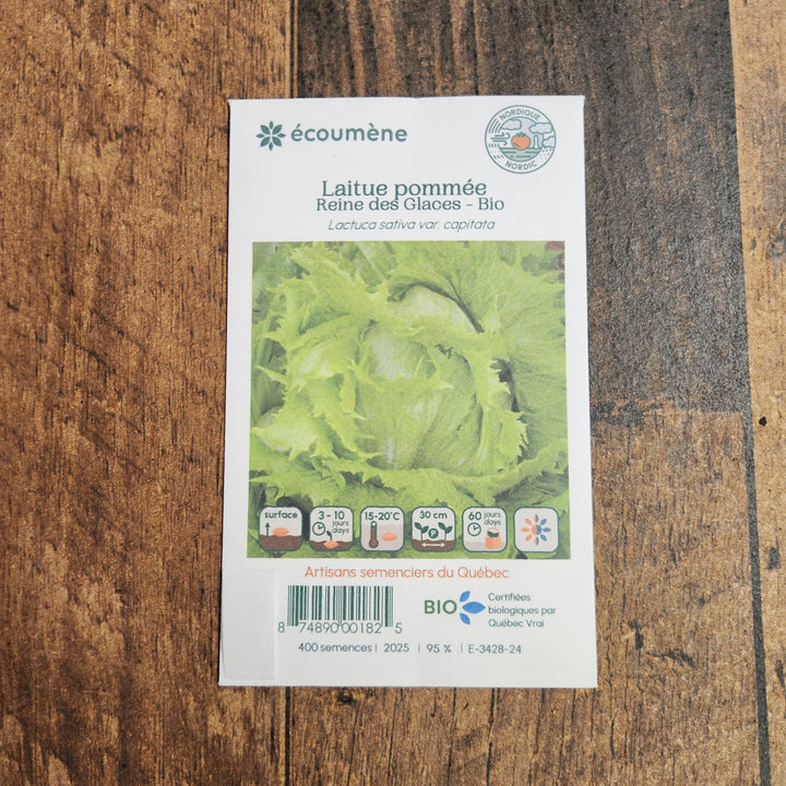 La Laitue Pommée "Reine des Glaces" des Jardins de l'Écoumène est une variété de laitue batavia très prisée pour ses pommes compactes et ses feuilles croquantes. Elle se distingue par sa résistance à la chaleur et sa capacité à tolérer les premières gelées, ce qui permet une culture prolongée au jardin.