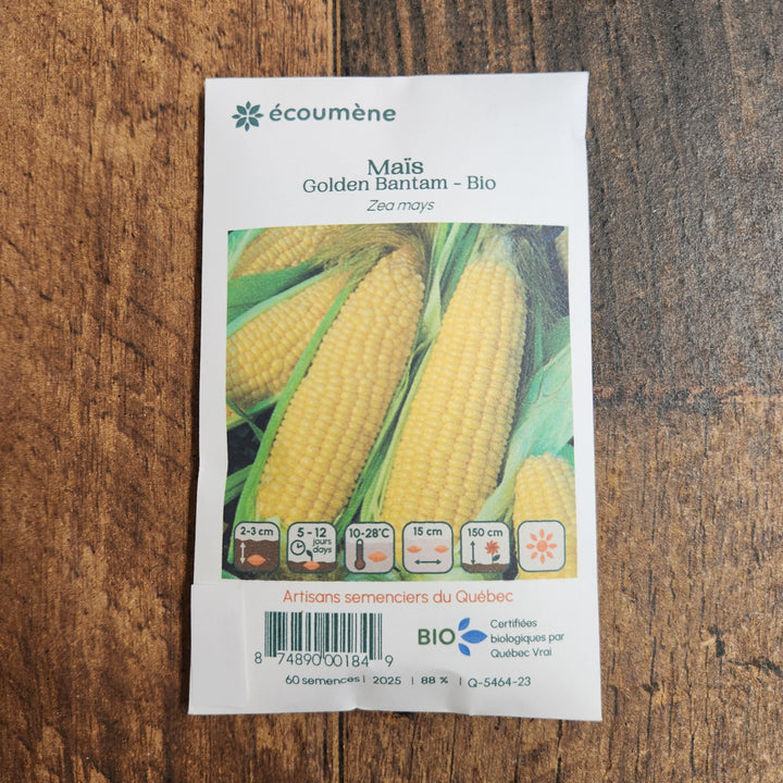 Maïs "Golden Bantam" des Jardins de l'Écoumène est une variété ancienne et réputée pour ses épis sucrés et savoureux, idéale pour les amateurs de maïs tendre.