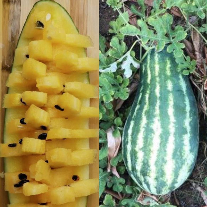 Le Melon d’eau jaune ‘Mountain Sweet’ (Citrullus lanatus) du semencier Gaia est une variété ancienne prisée pour sa chair jaune vif, douce et juteuse, idéale pour les journées estivales.